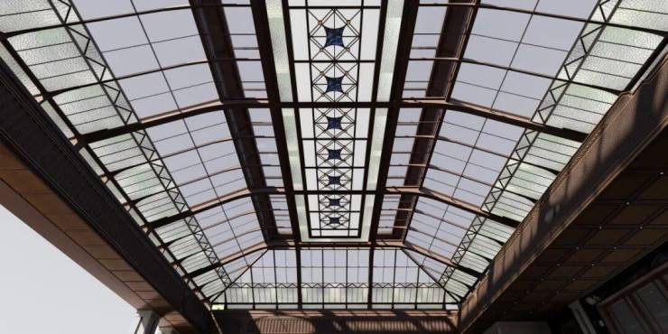 进入正门后是奢华酒店式落客区。抬头看,颇具标志性的彩色玻璃穹顶,仿佛穿越回了老上海,这显然是对外滩和平饭店代表性的玻璃穹顶的致敬。