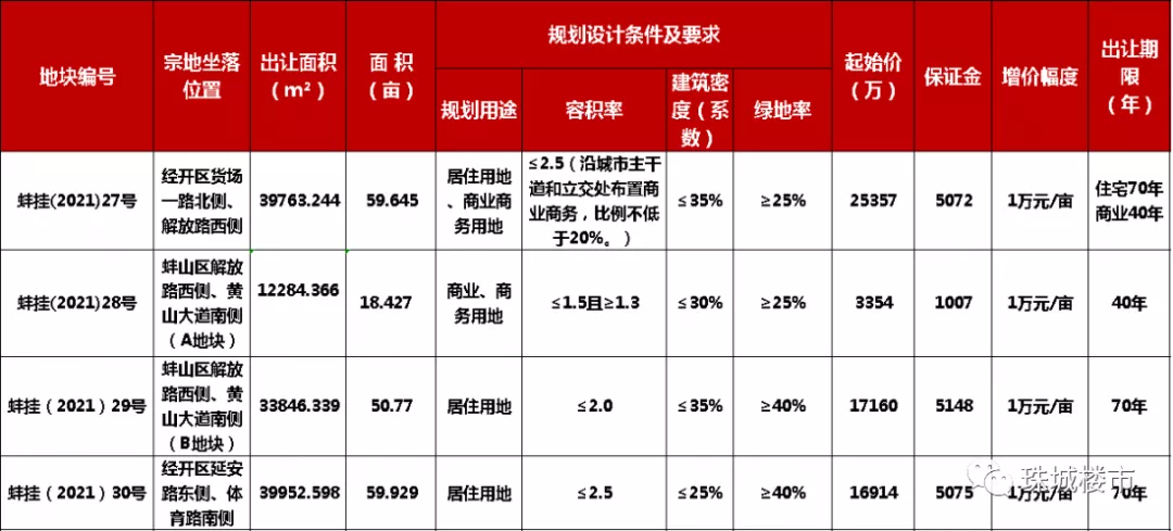 蚌挂(2021)30号地块位于经开区延安路东侧、体育路南侧;出让面积39952.598㎡(约59.929亩),规划用途为居住用地,容积率≤2.5,;