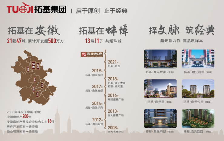 拓基集团,2000年创立于安徽合肥,历经20年发展布局,深耕蚌埠13载,已成为一家集地产开发、资产运营、物业管理、建筑施工四大战略板块的综合性集团公司。现已跻身中国地产200强,安徽本土房企20强,拥有房地产综合开发国家一级资质和物业管理国家一级资质。