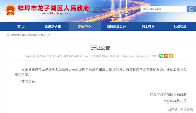 4月25日,龙子湖区正式发布公告:安徽省蚌埠市龙子湖区人民政府办公地址迁至蚌埠市东海大道1599号,自即日起正式在新址办公。