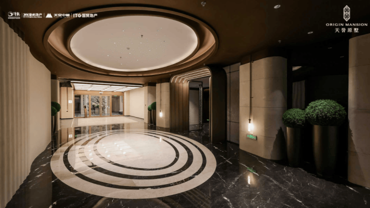 酒店式归家礼序:约54米恢弘门厅,配以约6.5米挑高门廊,两侧臻选金米黄石材与库班绿石材,艺术水景与名贵乔木掩映,归家的仪式感,从第一眼便极致拉升。