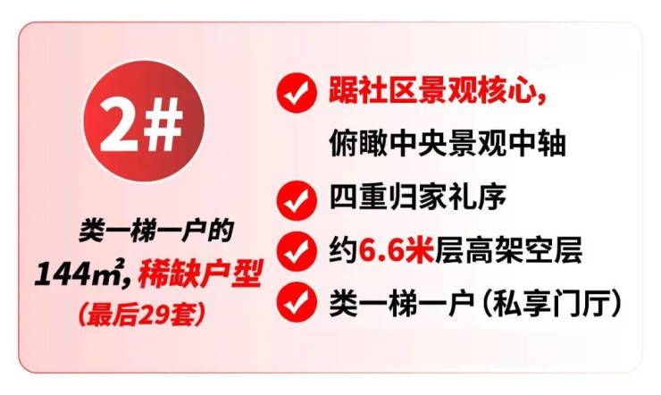 该栋约144㎡户型采用类一梯一户设计,享独立门厅体验,本次推出最后29套,席位珍贵。