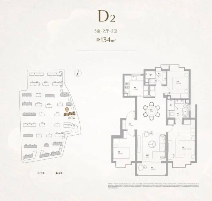 建面约134㎡3房,几乎可以看做是双套房的设计,尤其是主卧带浴缸和双台盆,保证了各个家庭成员的私密空间,适合一家三口的改善之选。