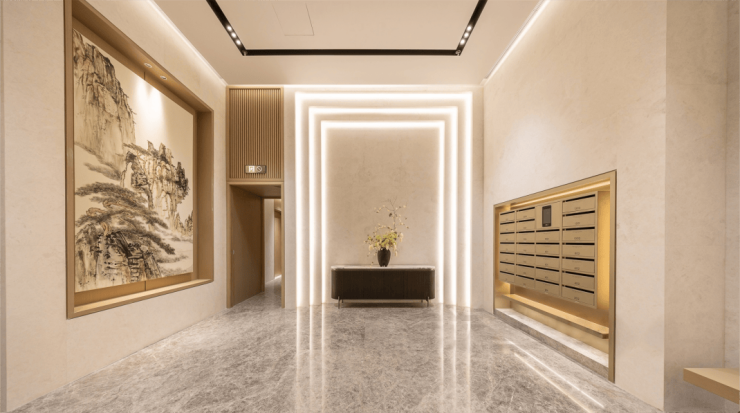 入户方面,相比2022年各大豪宅交付的毛坯大堂,天安1号的入户精装大堂尽显奢华,整个归家仪式感充满了艺术氛围。