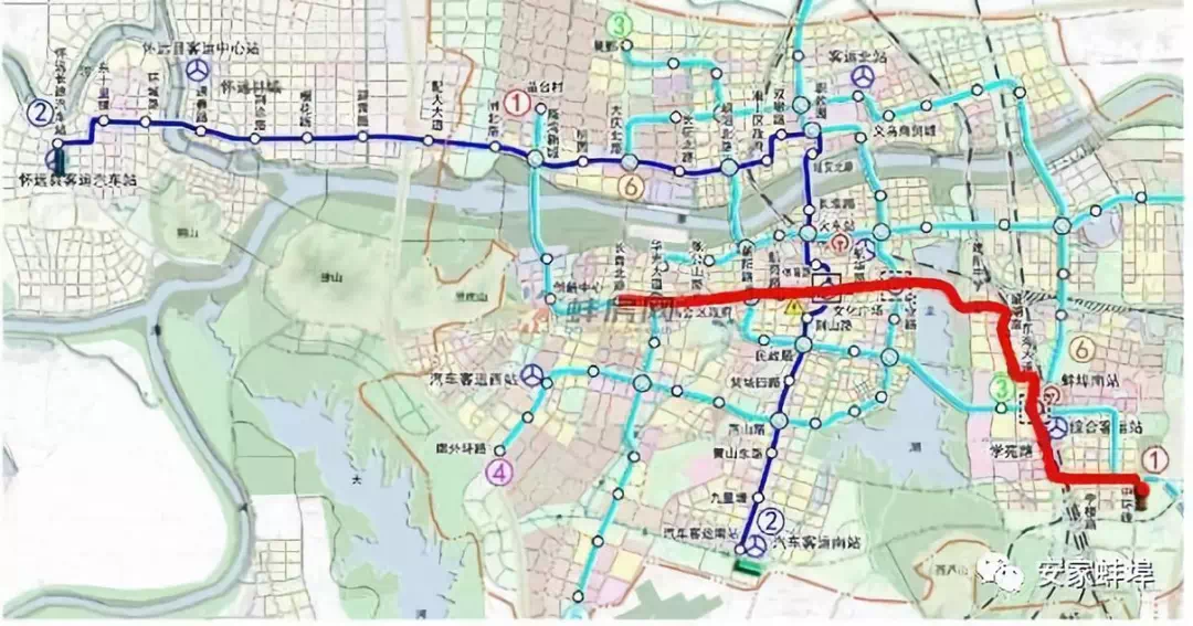 云轨2号线:S307-禹都大道-淮上大道-永安街-双墩路-昌明街-淮上大道-延安路-体育路-兴业街-延安路;设怀远西车辆段、汽车客运南站停车场各一座。起点为怀远长途汽车站,终点汽车客运南站。