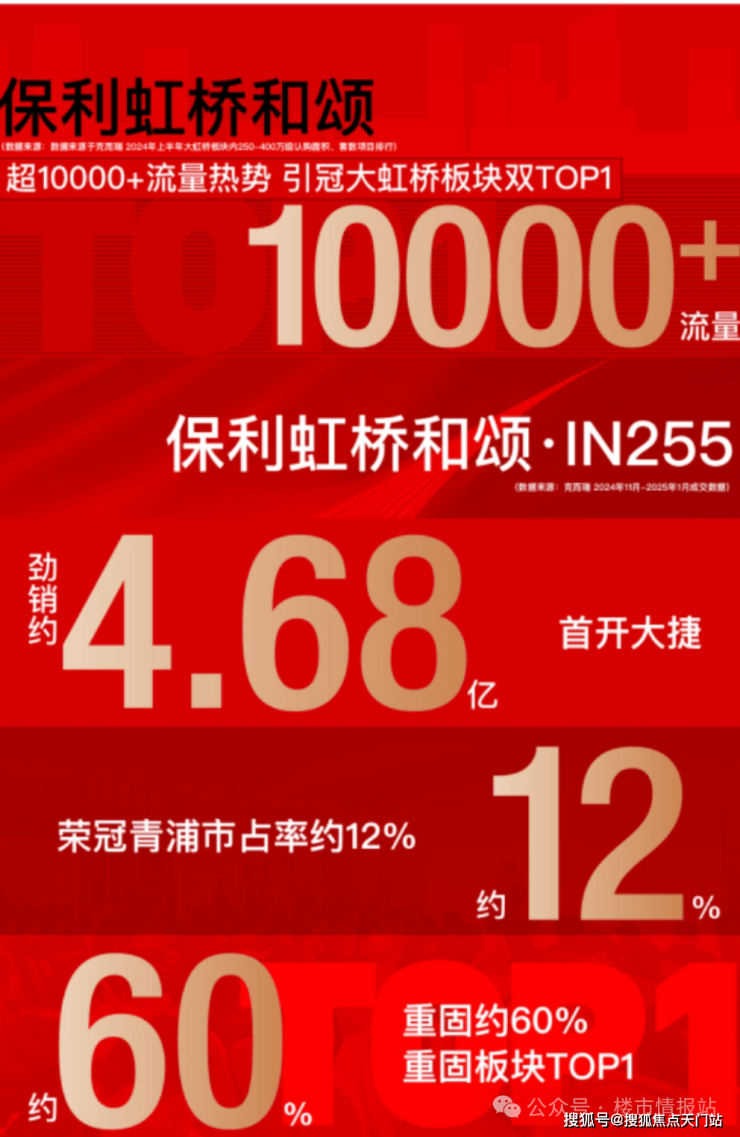 面对市场预期升温窗口期,保利虹桥和颂·IN255以300万级精奢三房、500万级改善四房迭代升级产品,强势锚定板块进阶需求,首开即强势斩获4.68亿元业绩,更以单盘青浦约12% 、重固板块约60%市占率,焕新激活板块价值跃迁。(数据来源:克而瑞2024年11月-2025年1月成交数据)