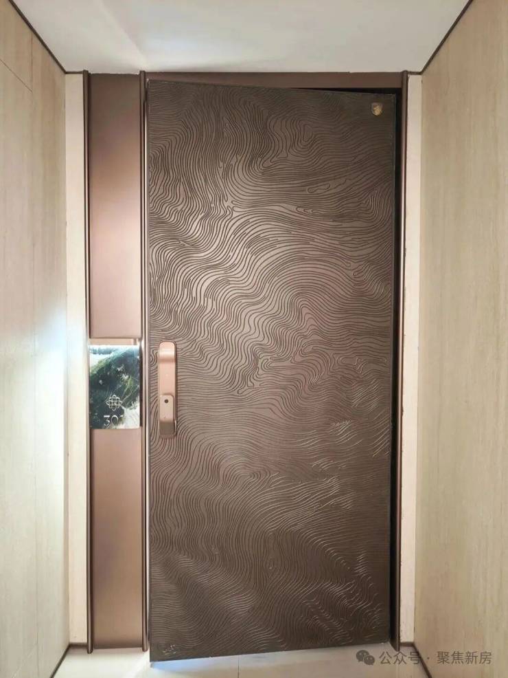 回归大家最关心的室内,品质一如既往,铝雕钢质门先声夺人,波浪状的金属纹路高级感满满,搭配日本松下多功能电子锁,保证了足够的安全性和私密性。