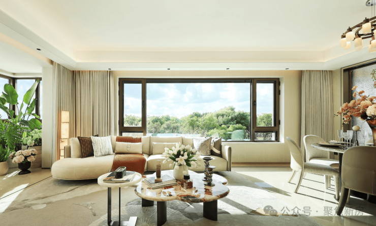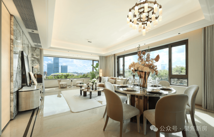 客餐尺度达约7.5米面宽,270°极致环幕窗景,实现了三面采光,无论在客厅、餐厅还是书房,葱郁园景皆如流动画卷,成为空间的主角。