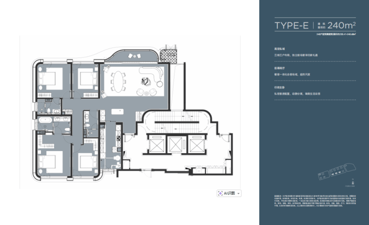 建面约240㎡户型,南北双套房设计兼顾代际需求,让每个家庭成员都能拥有独立静谧的奢居体验。