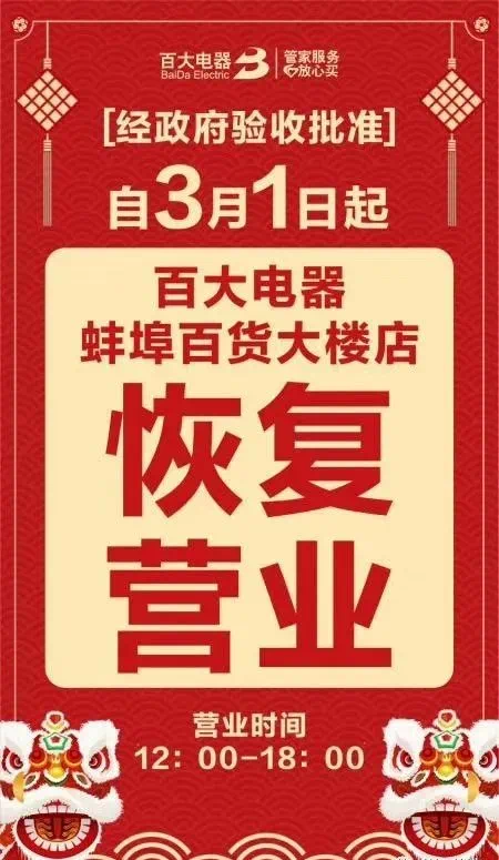 蚌埠百货大楼将于3月1日正式恢复营业,营业时间为12:00-18:00。