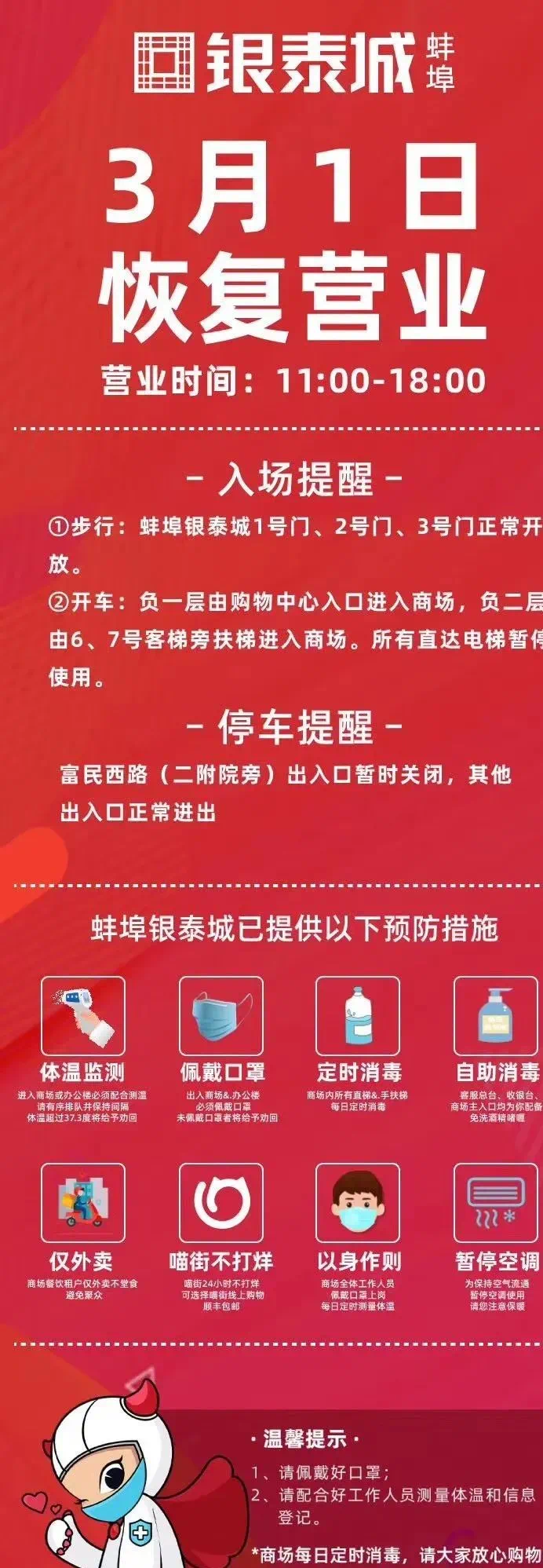 继售楼部开始营业后,蚌埠又迎来了好消息。各家商场纷纷发出开业通知! 蚌埠银泰城 蚌埠银泰城宣布将于3月1日正式恢复营业,营业时间更改为11:00-18:00,营业期间商场内餐饮不提供堂食。商场内的空调也处于暂时关闭的状态。 蚌埠万达广场 蚌埠万达广场也将于3月1日恢复营业,营业时间更改为11:00-