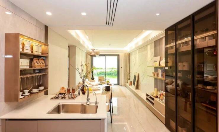 半开放式厨房,打破了传统的全封闭设计,与餐厅无界相通,面朝客厅与阳台,形成S型流畅生活动线,也打破了居家生活的空间隔阂,无形之间,增强家人之间在日常时刻的交流与互动。