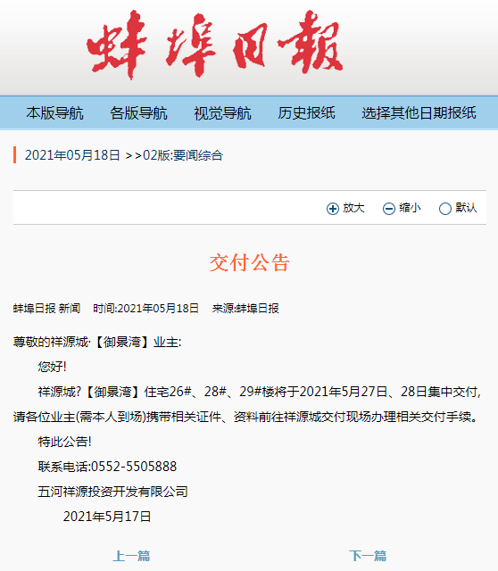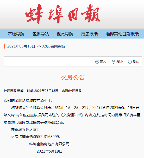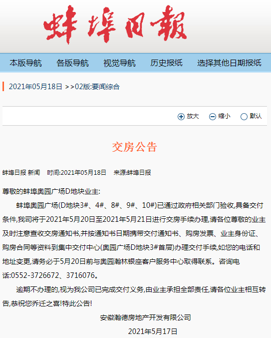 2021年5月18日,蚌埠日报公布了三篇交房公告,分别来自于奥园广场小区以及金鹏玖玖小区、五河祥源城御景湾小区;