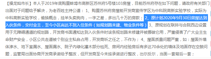 ①交房延期问题:据悉部分楼栋原定于2020年9月30日交付,但由于规划建设没有完成等各种原因延期半年多未交付;