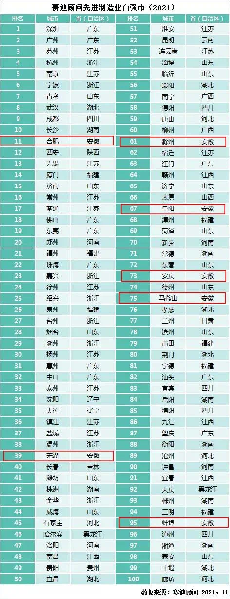 赛迪顾问智能装备产业研究中心近日发布《赛迪顾问先进制造业百强市(2021)》。我省合肥、芜湖、滁州、阜阳、安庆、马鞍山、蚌埠7个城市上榜,分别位列榜单第11位、39位、61位、67位、73位、75位、95位。