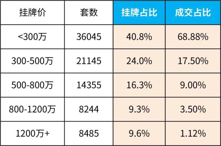 从我们统计的挂牌/成交占比来看,能发现500万级以上的市场,依然处于承压状态。