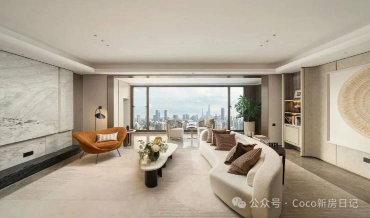 步入客厅,南向超大面宽带来豁然开朗的视野,搭配开放式厨房,LDK 一体化公区气场堪比不少180㎡以上户型。客厅与超1.8米进深阳台通铺设计,进一步延展空间感,通透大气。客厅背景墙采用弧形奢石工艺,成本不菲却质感卓绝。
