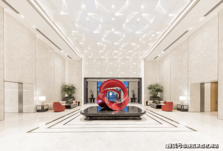 再来看看人行入户大堂,挑高的精装大堂搭配宝华标志性的太阳花装饰,连天花板都嵌入了星空灯光,整个大堂仿若拥有了星级酒店的落客体验。