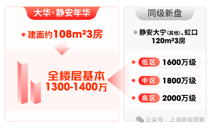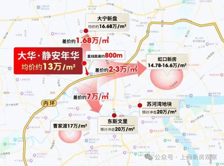 放眼整个静安区,曹家渡17万/㎡,东斯文里和苏河湾项目预计冲击20万/㎡,和大华·静安年华高层差价预计近7万/㎡。旁边虹口新房售价也已达14.78-16.6万/㎡。