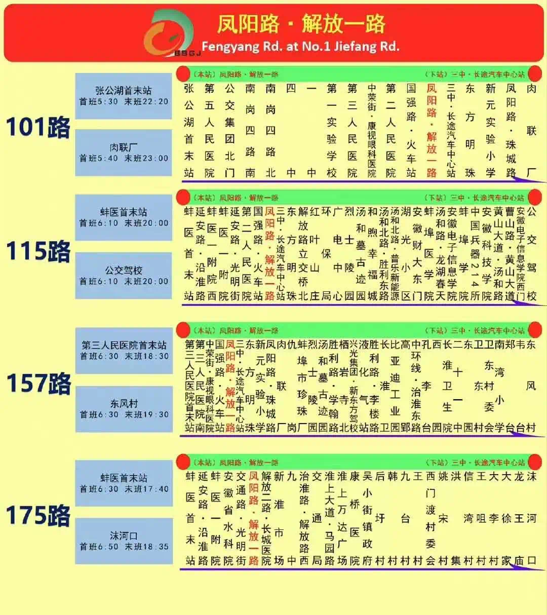 第三人民医院首末站、第三人民医院(南)、第三人民医院、南山宾馆、淮河路·中山街、淮河路·纬二路、正街·朝阳路、北大培文学校、上河路·淮上大道、上河路·双墩路、上河路·龙华路、龙华路·长征北路、特步小区、双墩村委会、双墩家园、朱海村、淝南村、三汊河国家湿地公园。