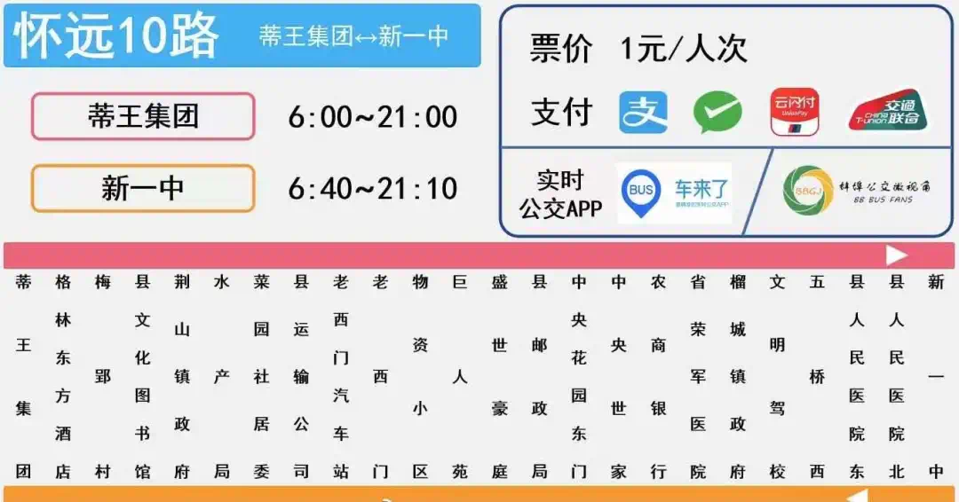 因怀远一中新校区教学安排变动,新一中22:20已无师生乘车需求,经校方与蚌埠公交怀远公司建议,现将怀远2路、10路新一中的末班调整为21:10。