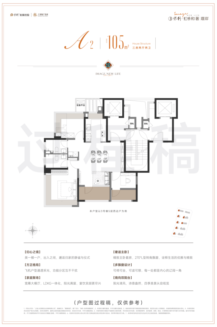 其次,南向双阳台+南北双约270°转角飘窗,增加了大量的实际使用空间,所以虽然是建面约95-108㎡的3房产品,但这两个户型的尺度感是相当惊艳的。