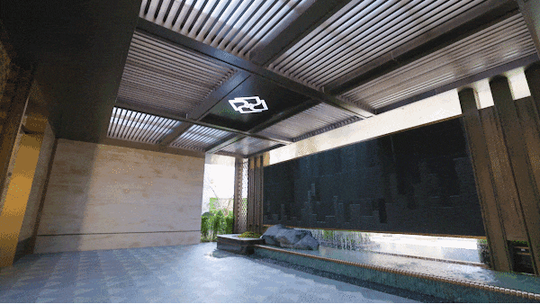 入户花园采用对称式花池和景墙设计,高定发光格栅花池,搭配丰富植被植物,随景入户,仪式感归家,潺潺水流平静心灵。