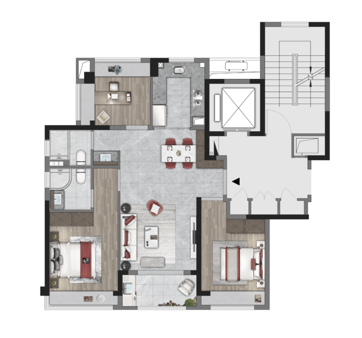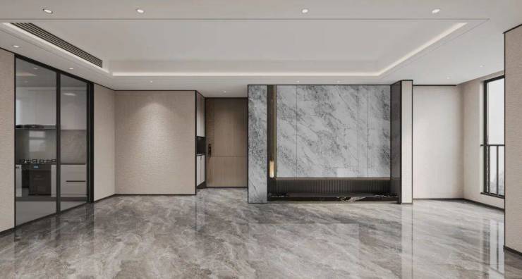 客餐厅一体化,连接南向阳台,视觉上延伸了空间,加强了公区的尺度感,通透性也更强。