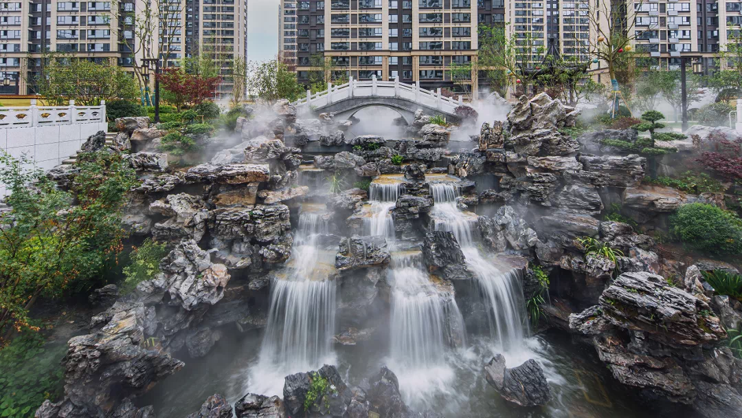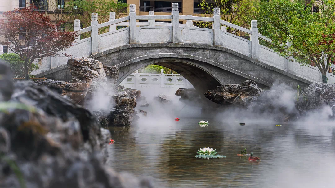 行走至中庭,采用三个错落的景观微地形围合,令媒体大咖称赞不已,亭台桥榭、花木石草、小桥流水等互相组合,疏密得宜、张弛开合。