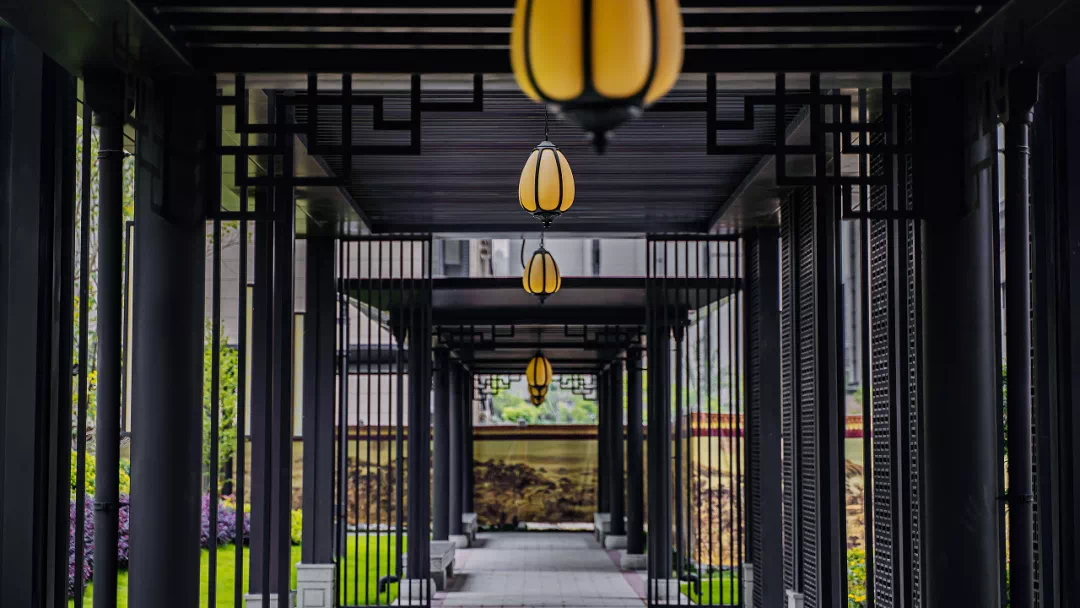 抬头可见的是重檐庑殿顶,结合现代工匠技法,打造了盛世飞檐,重檐屋角则是飞檐的较高规制。行走至中庭,采用三个错落的景观微地形围合,令媒体大咖称赞不已,亭台桥榭、花木石草、小桥流水等互相组合,疏密得宜、张弛开合。