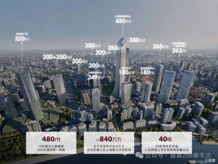 北外滩将建设480米高的浦西第一高楼——上海北外滩中心,未来将携19栋摩天大楼集群共筑上海崭新天际线。