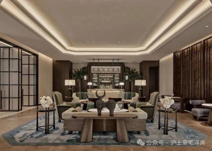 设计师以「在地性重构」为笔,在老上海的肌理上勾勒出流动的文化切片。负一层空间以谦和的弧度展开叙事:雕塑感屏风与铸铁壁炉构成刚柔对话,博古架造型的悬浮柜体将中式雅集转化为当代社交场域,物与物在此辉映成趣。