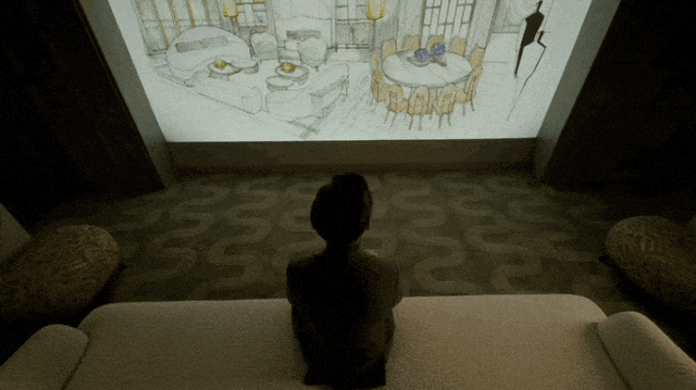 主厅核心区悬浮式定制柜体,银箔与丝绸在几何切割中构建中式基因,毕加索石材的天然裂变肌理成为天然艺术装置。瀑布吊灯以流体力学演绎东方留白,让光影在岩板表面生长出动态水墨意境。