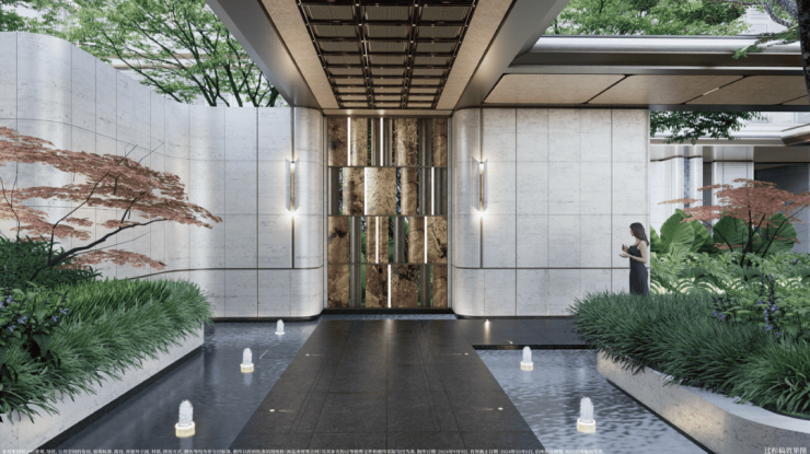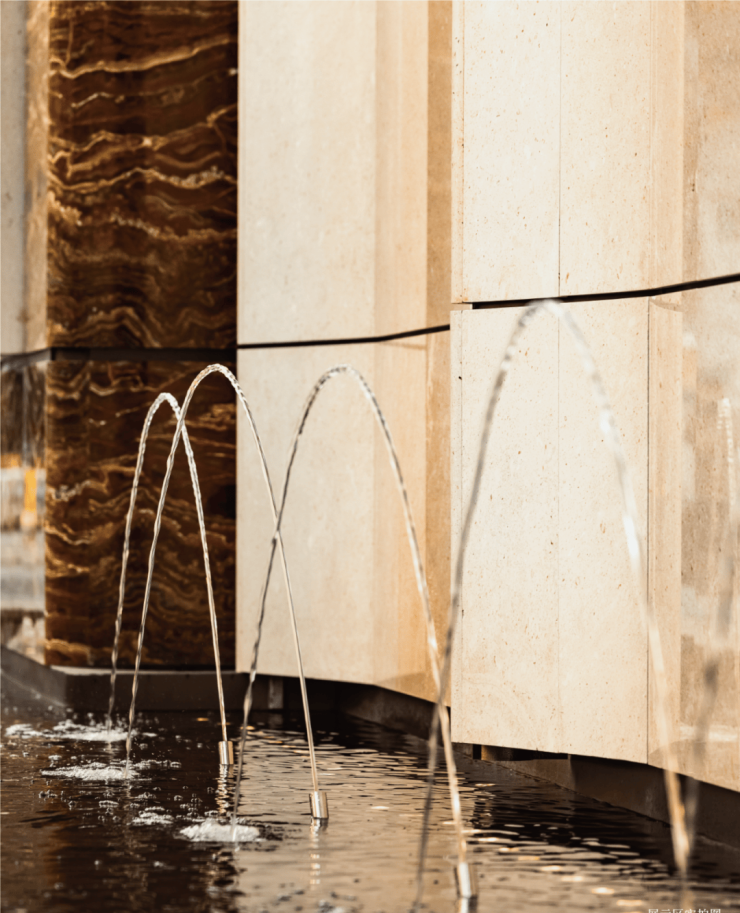 在门庭外,辅以两侧具有仪式感的跳泉水景,将建筑的圆弧美感与自然水景相合,共同构成海上·清和玺“贵雅清和”的城市界面。