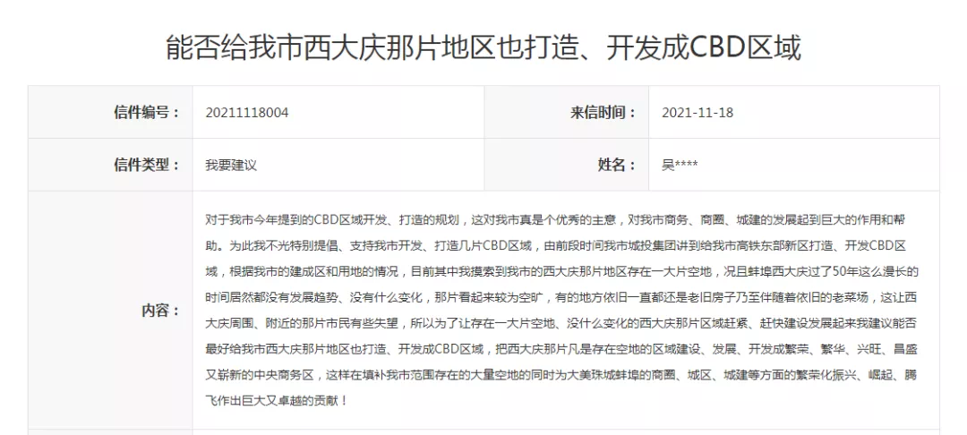 我曾有一回在网上看到如今蚌埠西大庆的拍摄视频说蚌埠西大庆过了50年这么漫长的时间居然都没有发展趋势,看起来较为空旷,有的地方依旧一直都还是老旧房子乃至伴随着依旧的老菜场,这么一说我超期待一个崭新的西大庆,我希望西大庆及其附近地区不久就能迅速发展成一座城、发展成我市的一片新城区,我希望西大庆及其附近地区较好发展成一片大都市化繁荣的新城区体现西大庆及其附近地区城景大变革,就比如尽可能建设很多座各种大都市化繁华的楼房;其中我看蚌埠西大庆及其附近其它地区比如尤其位于华光大道与胜利路交界处沿华光大道向南走一小段路的东西两侧地区、中粮大道/大庆路与胜利路交界处的东南处那片还存在好像有点像是乡村式的几层老房子、胜利路从中粮大道/大庆路与胜利路交界处往西一小段路后的南北两侧以及北至胜利西路、南至东海大道以南、西至黑虎山路、东至中粮大道那么一大片地区,我希望这些较为空旷的地区不久就能迅速发展成一座城、发展成我市的一片新城区,乃至较好发展成一片都市化繁荣的大都市化新城区,就比如建设很多座若干座各种大都市化繁华的楼房(其中给中粮大道/大庆路与胜利路交界处的东南处建设很多座若干座各种都市化繁华的楼房发展成一座城、发展成我市的一片新城区、乃至较好发展成一片都市化繁荣的新城区的同时较好把那片好像是乡村式的几层老房子拆除。)。总之,我希望我市西大庆及其附近地区包括以上凡是我提到的地区都赶紧、尽快、趁早发展成一座繁华、昌盛、兴旺的大都市化新城区以体现西大庆及其附近地区城景大变革,这样还能扩大我市城区范围面积让我市不再是市民所感觉的小城市。禹会区:尊敬的网友: 您好!感谢您留言对我区城市建设提出宝贵的意见建议。根据“十四五”发展目标任务,我区将坚持高质量发展、创新引领和以人民为中心的总体要求,加快城市更新和产业升级,按照“一带引领、三核支撑”总体布局,找准支撑项目,立起禹会“十四五”经济社会高质量发展的“四梁八柱”,着力将禹会打造成“山水人文城区、科创产业高地”的城市片区形象。请您持续关注!谢谢
