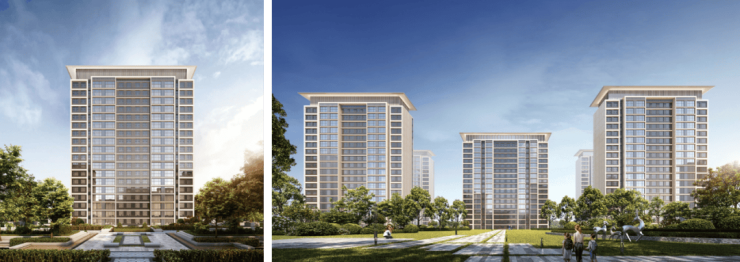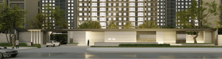 外立面采用经典时尚现代主义风格:通过温和的色彩搭配、简练的横向线条、黄金比例的立面比例、极简抽象的建筑符号、建筑顶部的飘板,呈现一个现代风格和艺术气质结合的高品质社区。