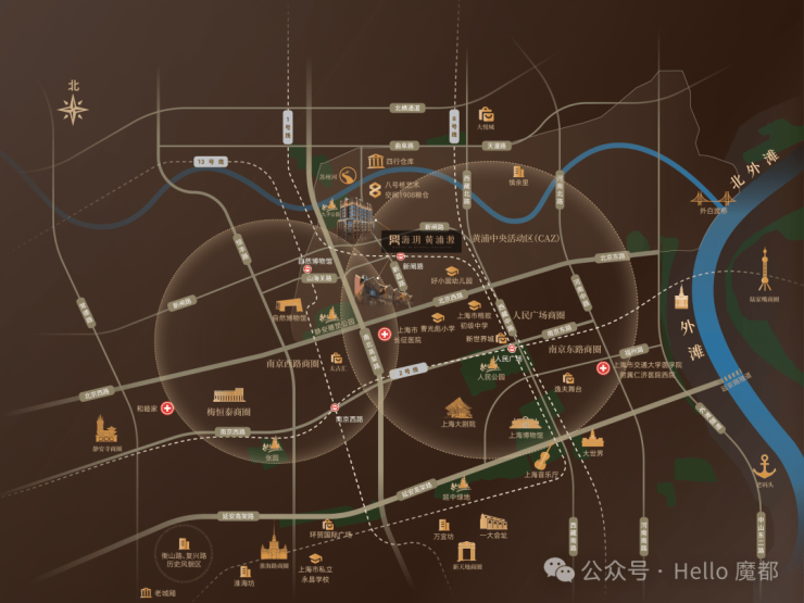 以项目本身所在人民广场商圈为中心,南至新天地,西至南京西路梅恒泰商圈,静安寺商圈,淮海路商圈,东至外滩开车5-10分钟可达