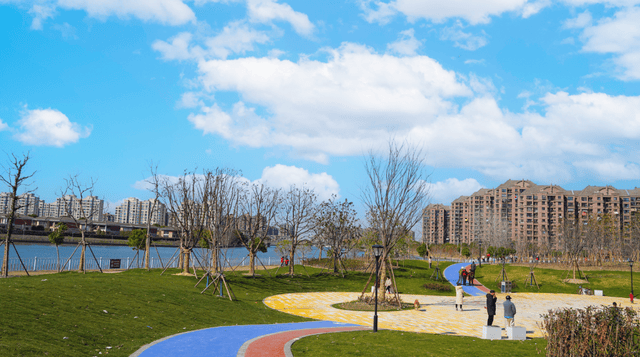 占位上:整个社区的北侧与东侧双面环水、西侧是商业,不止有繁华的城市街景,更有滨水风光,光这个社区的占位和天赋,就已经足够出色。
