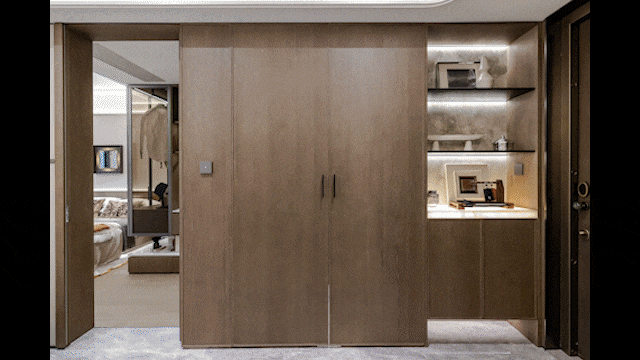 该户型外部呈类一梯一户设计,将近10㎡的电梯厅空间成为家的延伸,配合门内玄关形成内外双玄关格局,大幅度提升了居家的私密性和仪式感。