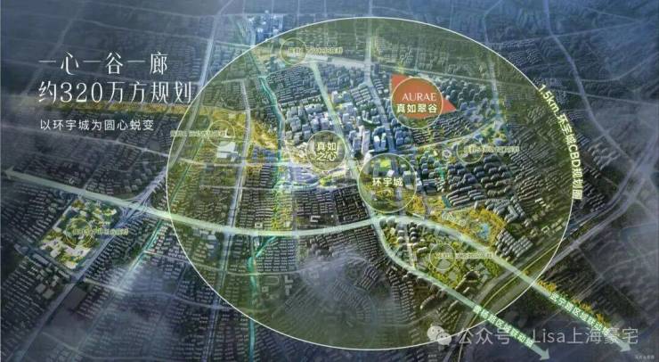 真如最新规划将围绕“一心一谷一廊”,以环宇城为核心,在1.5 公里半径范围内呈现全新的城市发展格局,打造一座约320万㎡的超级CBD大城。