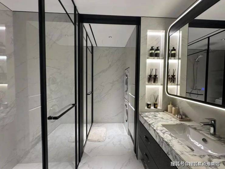 ✔卫生间地面和墙面整体性也非常强,奢石台面的纹路和岩板墙面和协调。