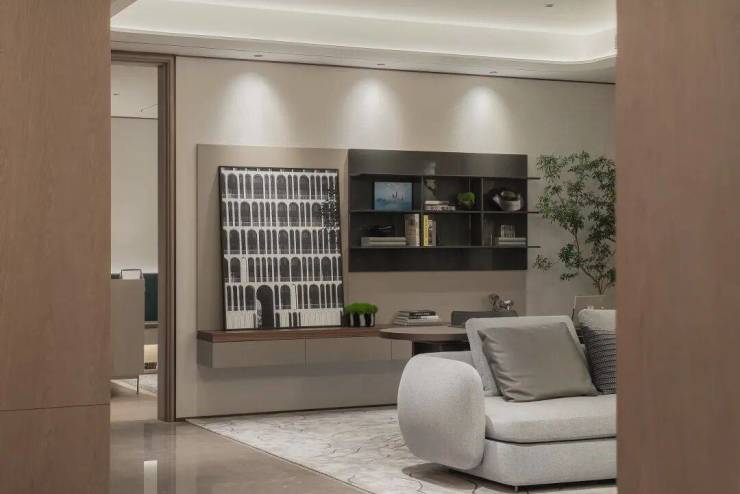 这还不是重点,玄关座椅背后,是一面皮革包裹的墙面。已经想象出业主未来的归家场景:坐在此处换鞋,往后随意倚靠,触碰到的不是冰冷的墙面,而是质感柔软的皮革,卸下一日疲惫与风尘再步入双厅......