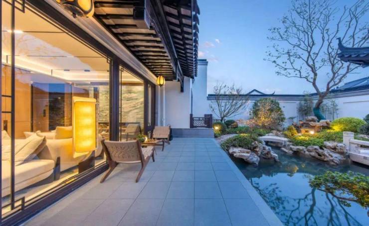 大宅后花园,采用了围合式的建筑结构,有泗水连廊、有金鱼戏水,彰显中式大宅的典雅大气。