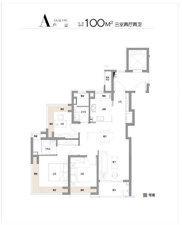 100㎡户型,双270°飘窗设计(南向主卧+北向书房),南次卧、厨房、双卫飘窗,厨房烟道外移,飘窗配置抽屉,极致空间利用率。