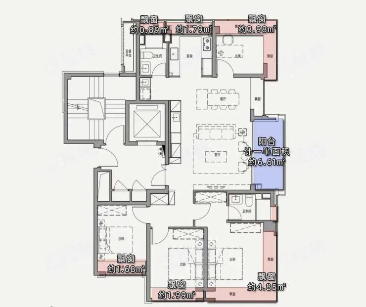 超高得房率户型,飘窗可砸,100㎡A户型,砸完多出约6㎡;137㎡F户型,砸完多出约11㎡,附赠多出来的空间,未来可随家庭需求,灵活延伸。