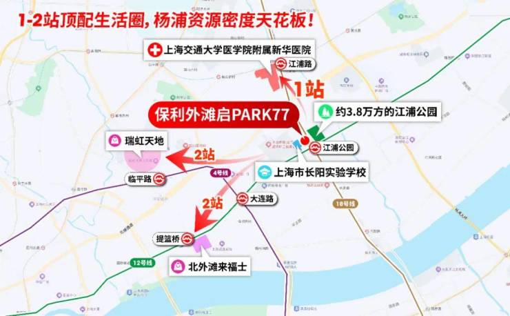 ②、1-2站顶配生活圈,杨浦资源密度天花板!项目东侧就是约3.8万方江浦公园,西侧上海市长阳实验学校;