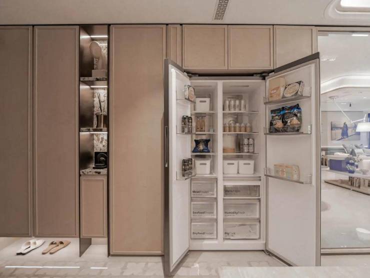 以137㎡户型为例,进门右手边是一门到顶的玄关柜收纳,转角之后,还有一个进深约60cm的豪华收纳,可以用来收纳业主的行李箱、童车、平衡车等等。