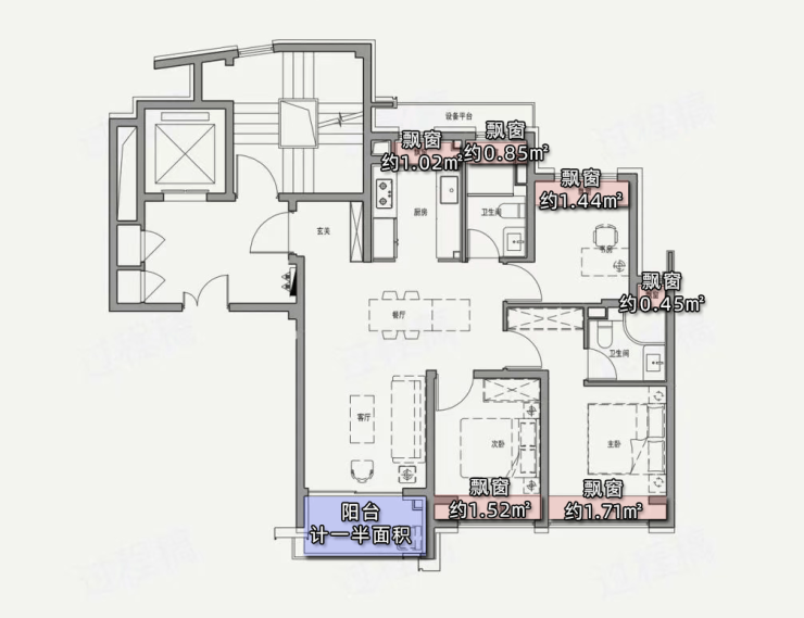 项目百平三房,在计算阳台一半面积+飘窗赠送面积的情况下,实得率可以达到91%左右,完美覆盖了当下普通高层的得房率痛点。