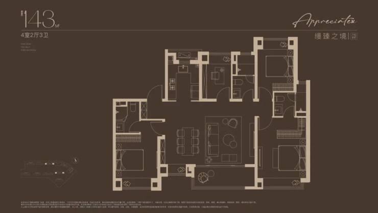 建面约143㎡四房设计,不论是三代同堂还是二娃家庭,都舒居无忧!2梯2户的设计, 极具私密性的入户门厅,彰显大宅归家礼序 。独立玄关,既是归家仪式感,更添收纳空间;约14米朝南面宽,搭配约7米尺度横厅,尽显大宅风范; 东西双套房设计,奢享全龄世家的静谧时光。
