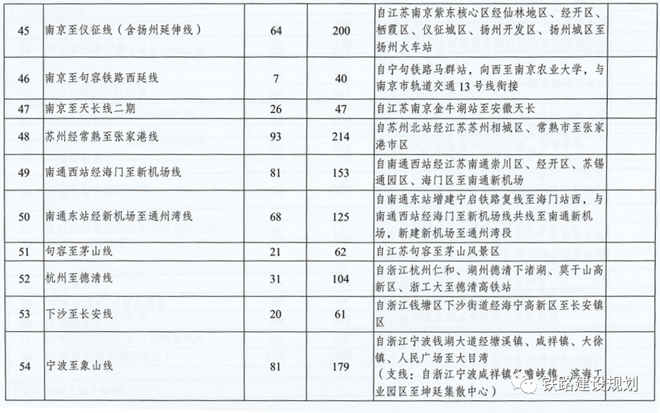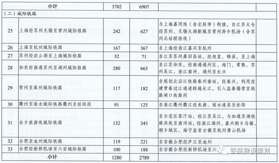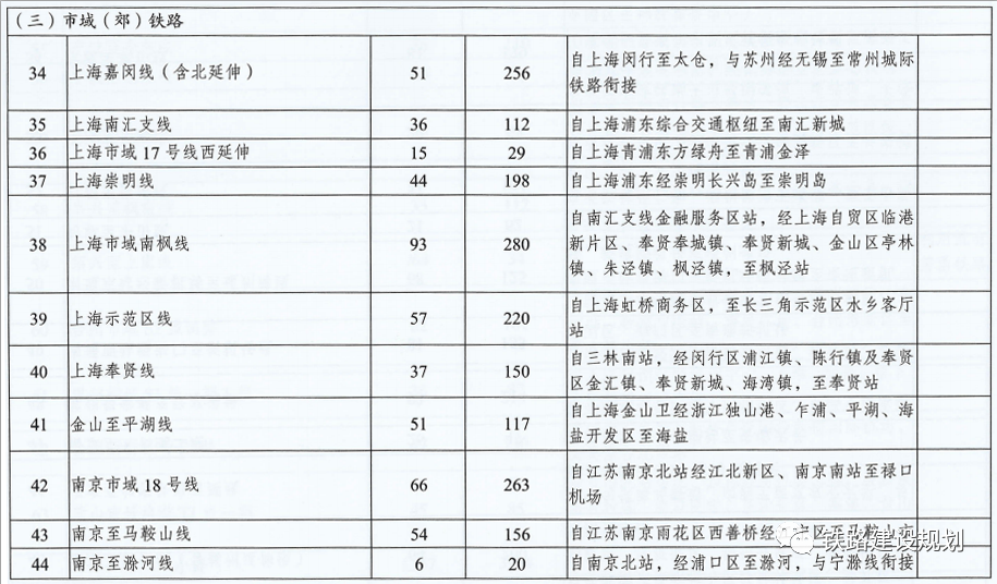 一、干线铁路1、沿江高铁合肥至南京至上海段2、沿江高铁合肥至武汉段3、上海经乍浦至杭州铁路4、上海经乍浦至杭州货线铁路5、南京经滁州至蚌埠铁路6、南京至杭州铁路二通道7、南京至宣城铁路8、盐城经泰州无锡常州宜兴至湖州铁路9、扬州经镇江南京至马鞍山铁路镇江至马鞍山段10、新沂至淮安铁路11、新沂至合肥铁路宿迁至泗县东段12、南通经苏州嘉兴至宁波铁路(含如东延伸段)13、杭州经临安至绩溪铁路14、杭州湾货运铁路15、杭州至丽水铁路义乌至缙云段16、义乌至金华铁路17、宁波经台州至温州铁路18、温州至福州铁路19、阜阳至黄冈高铁20、六安至庐江铁路21、六安至安庆铁路22、三门峡经亳州至宿州铁路安徽段23、新长铁路扩能改造24、宁芜铁路扩能改造二、城际铁路1、上海经苏州无锡至常州城际铁路2、上海至杭州城际铁路3、苏州经淀山湖至上海城际铁路4、如东经南通苏州至湖州城际铁路5、常州至泰州城际铁路6、衢州至丽水城际铁路衢州至松阳段7、水乡旅游线城际铁路8、合肥至池州城际铁路9、合肥经新桥机场至六安城际铁路三、市域(郊)铁路